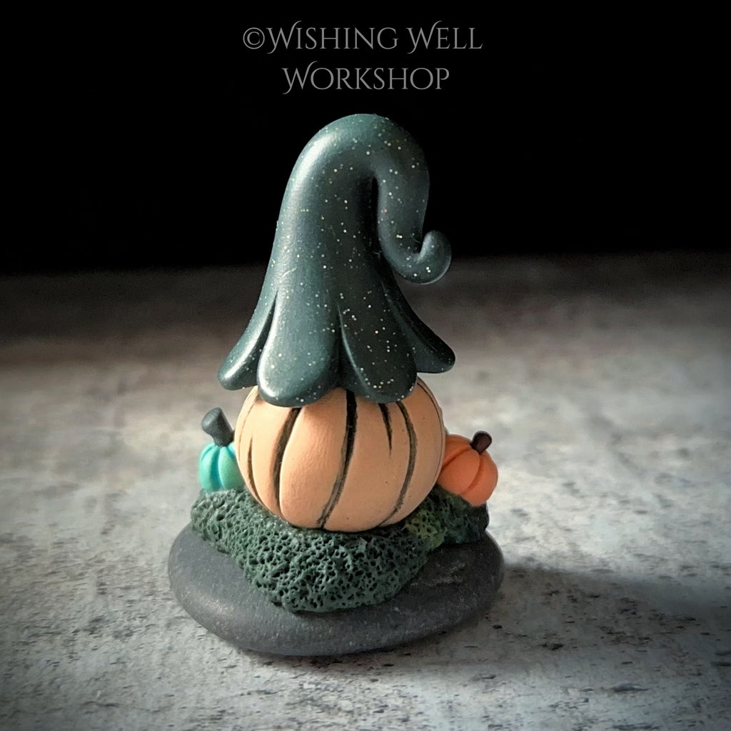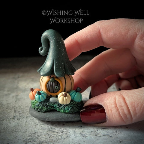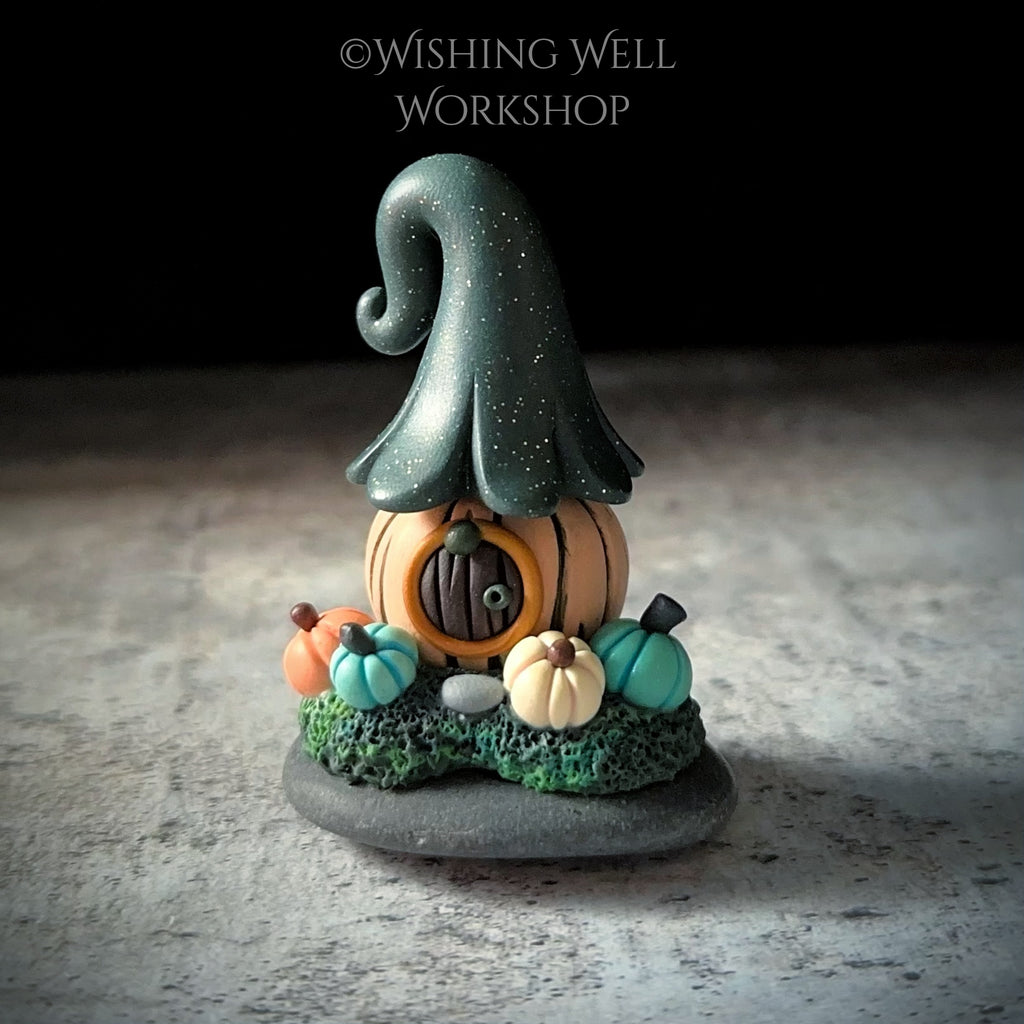This charming little pumpkin cottage will add a little magic to any small space! Hand sculpted using a custom color polymer clay palette, this Halloween house sits atop a real ocean rock from Kodiak, Alaska. At about 2 1/2" tall it's delightful placed in a small houseplant, fairy garden, terrarium, or bookshelf.
