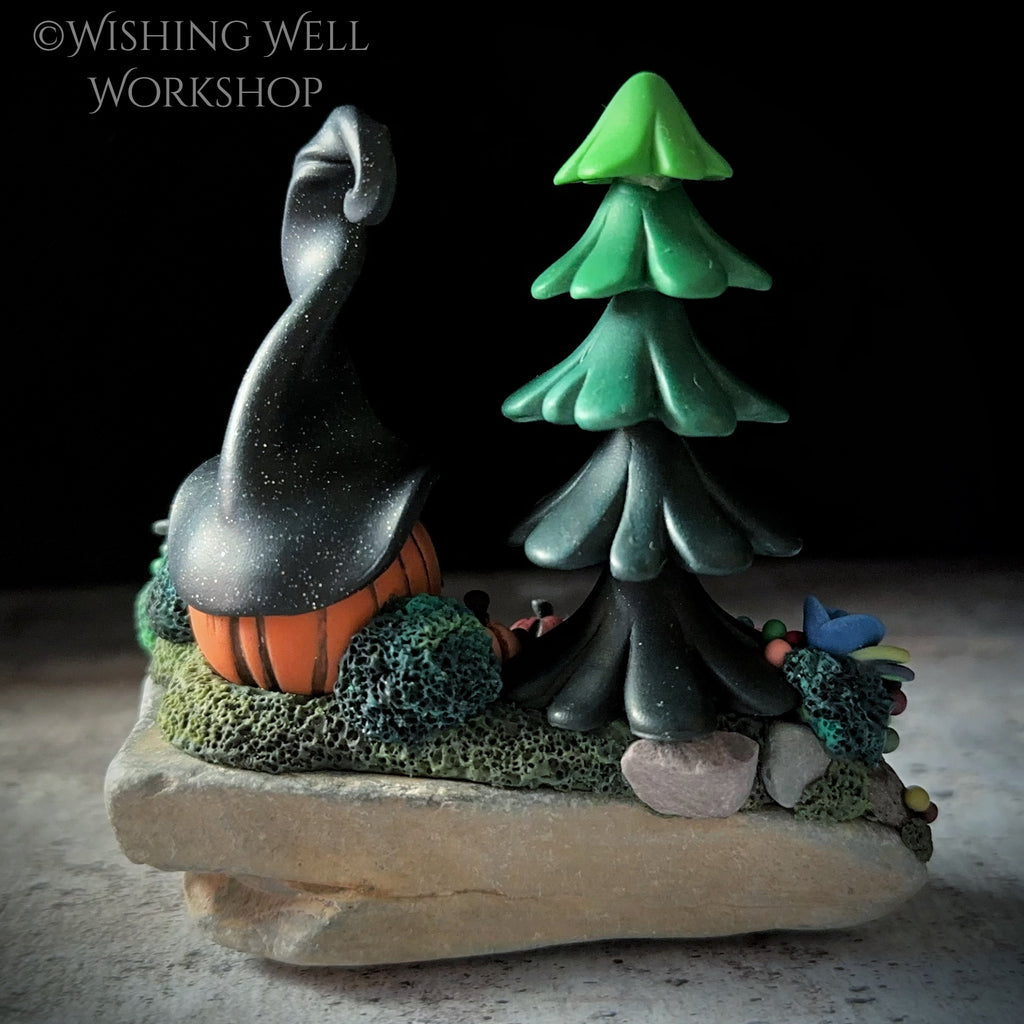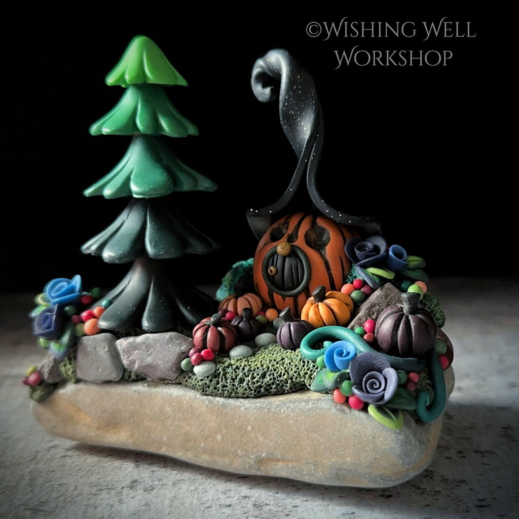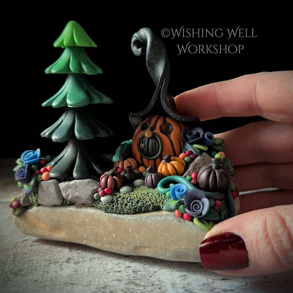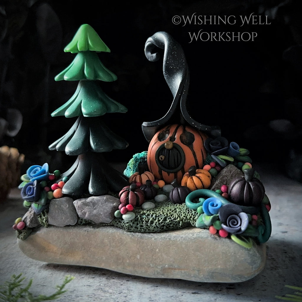 This charming little pumpkin cottage will add a little magic to any small space! Hand sculpted using a custom color polymer clay palette, this Halloween house features real quartz crystals and is mounted on a real lake stone. At about 4" tall it's delightful placed in a small houseplant, fairy garden, terrarium or bookshelf.